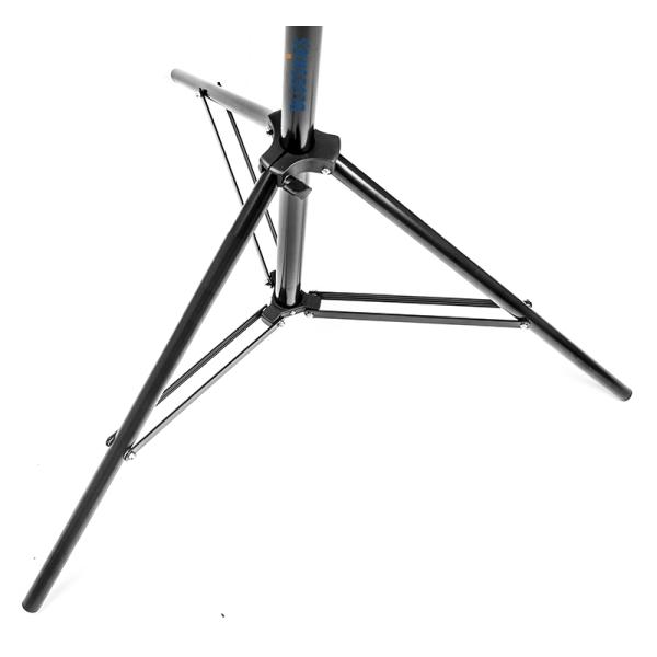 This is a compact designed light stand. The material of stand tubes is aluminum alloy, light weight but steady. This light stand is designed to be compact, with 4 sections of tubes. It's easy to set up and fold, and convenient to carry.